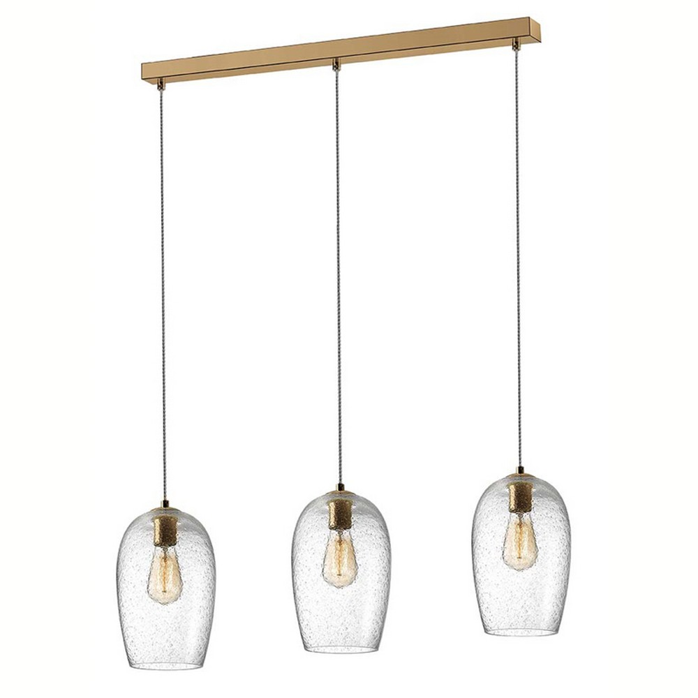 Τρίφωτο φωτιστικό οροφής σε διάταξη ράγας, με διάφανο φυσητό γυαλί και οξυντέ (μπρονζέ) ανάρτηση.