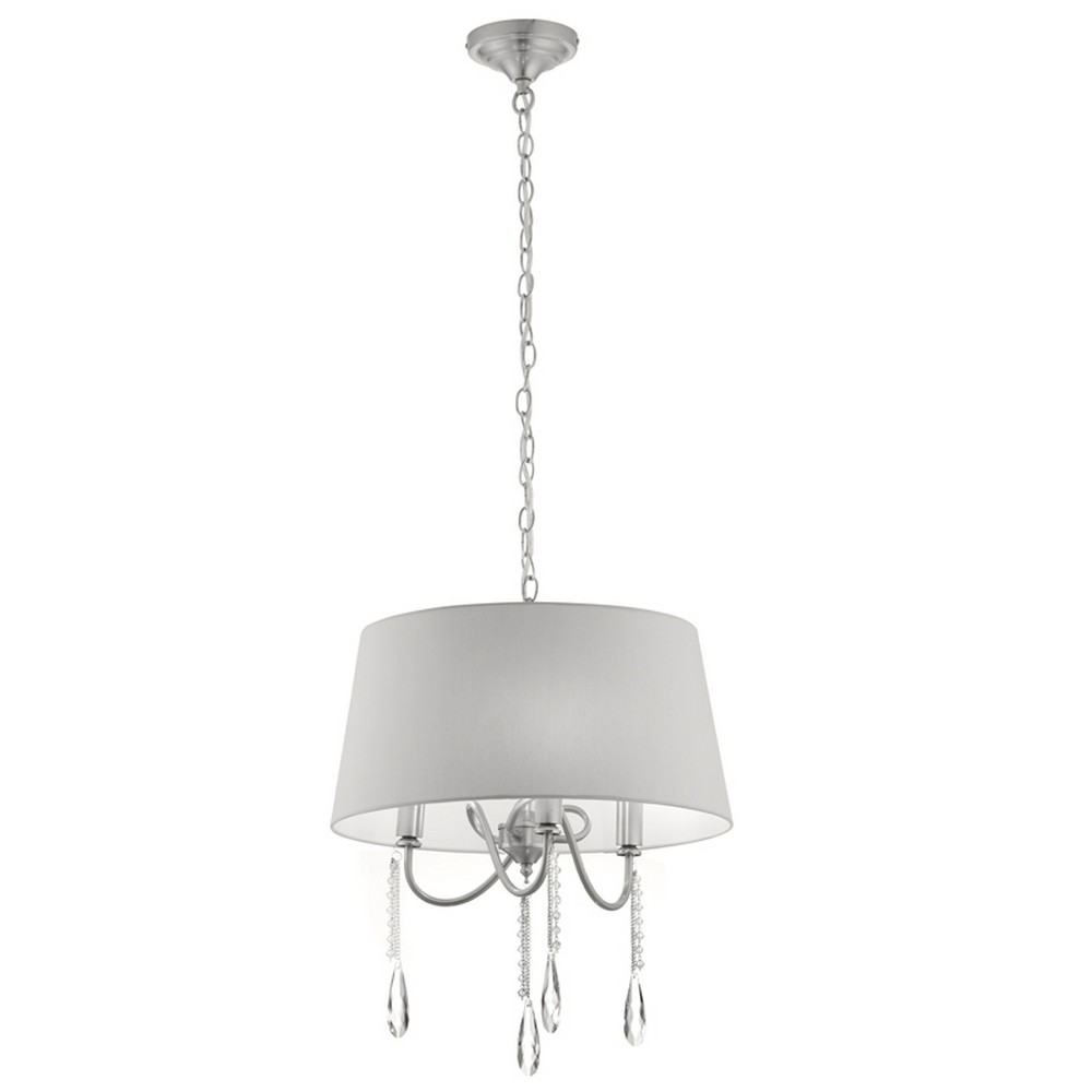 Κλασικό φωτιστικό κρεμαστό τρίφωτο με μεταλλικό ματ σκελετό σε χρώμα νίκελ, γκρι αμπαζούρ και διακοσμητικά κρύσταλλα από την σειρά Ellaria της Viokef.