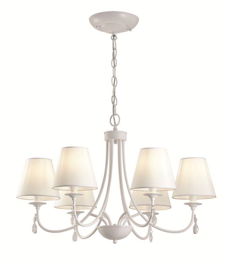 Εξάφωτο φωτιστικό οροφής με λευκά υφασμάτινα καπέλα και λευκή ανάρτηση με διακοσμητικά κρύσταλλα.