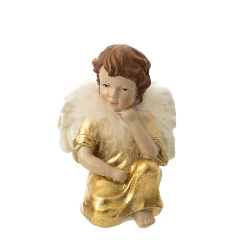 Πολυεστερικός χριστουγεννιάτικος άγγελος σε χρυσό χρώμα με λεπτομέρεια από λευκό πούπουλο. Ιδανικό για κομψή και γιορτινή διακόσμηση. Διαστάσεις: 9,5x8x14 εκ.