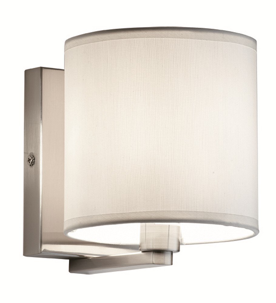 Μοντέρνα απλίκα με λευκό καπέλο από πλαστικοποιημένο ύφασμα και βάση σε νίκελ ματ χρώμα με διακόπτη-κορδόνι στο κάτω μέρος.