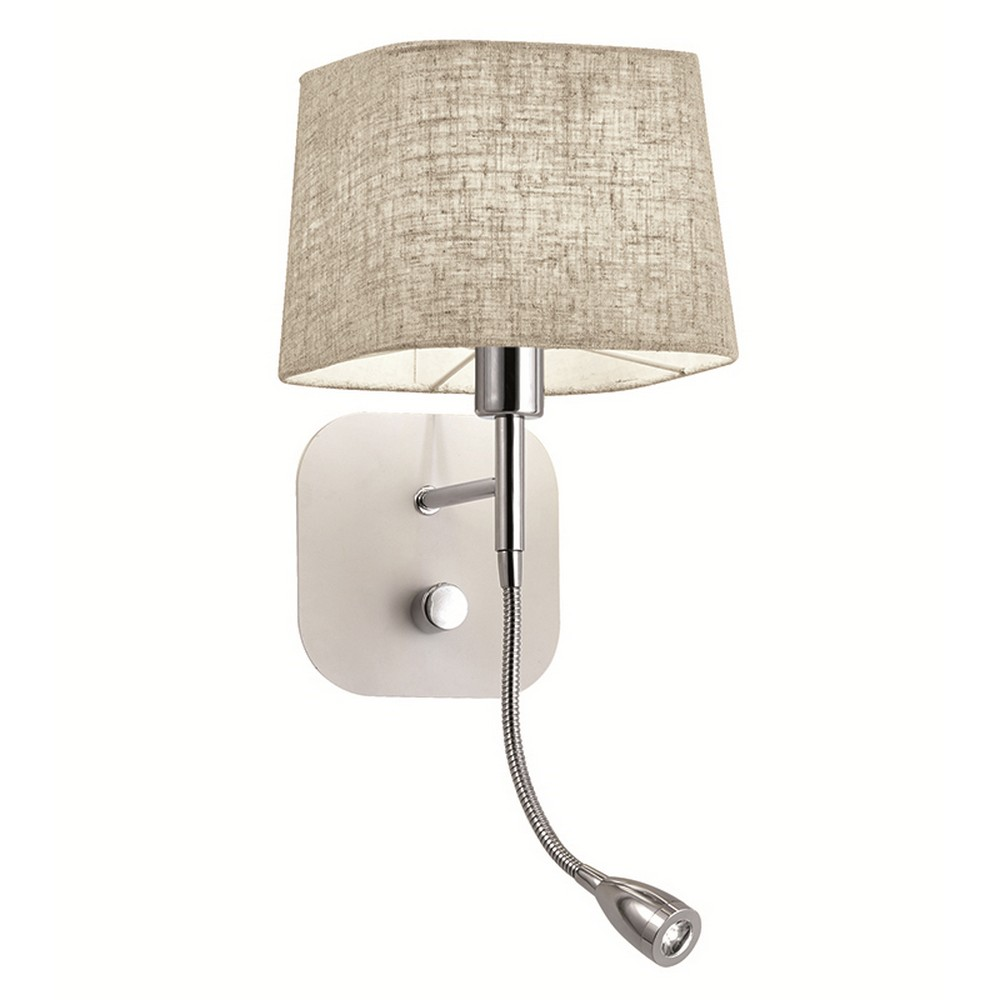 Μοντέρνα απλίκα με μπεζ καπέλο από πλαστικοποιημένο λινό ύφασμα και μεταλλική λευκή βάση με λεπτομέρειες σε νίκελ ματ.