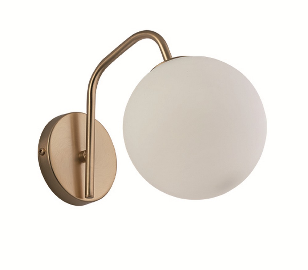 Απλίκα με κυρτό μπράτσο, γυαλί οπάλ σε λευκό ματ χρώμα και μεταλλική βάση σε χρυσό ματ χρώμα.