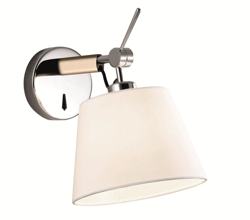 Μοντέρνα απλίκα με δυνατότητα κίνησης και λευκό καπέλο από πλαστικοποιημένο ύφασμα. Διαθέτει μεταλλική βάση σε χρυσό ματ χρώμα με νίκελ ματ λεπτομέρειες.