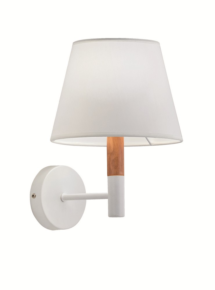 Μοντέρνα απλίκα με λευκό καπέλο από πλαστικοποιημένο ύφασμα και λευκή βάση με λεπτομέρεια σε ξύλο.
