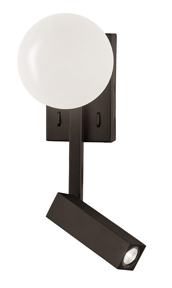 Μοντέρνα απλίκα τοίχου με λευκή σφαίρα 10 εκατοστών από οπάλ γυαλί και μεταλλικό σποτ σε μαύρο χρώμα.