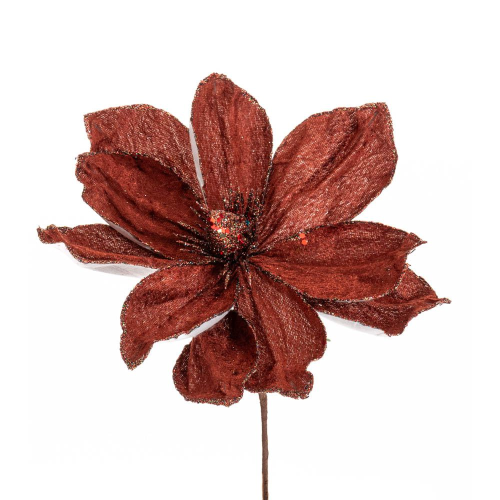 Εντυπωσιακή διακοσμητική μανώλια σε χρώμα μπορντώ, ιδανική για χριστουγεννιάτικες ή εποχιακές συνθέσεις. Το πικ με διάμετρο 20x20εκ. προσθέτει πολυτέλεια και κομψότητα σε κάθε διακόσμηση, είτε τοποθετηθεί σε βάζο είτε σε στεφάνι ή στολίδι. Ένα διαχρονικό άνθος που χαρίζει ζεστασιά και λάμψη στον χώρο σας.
