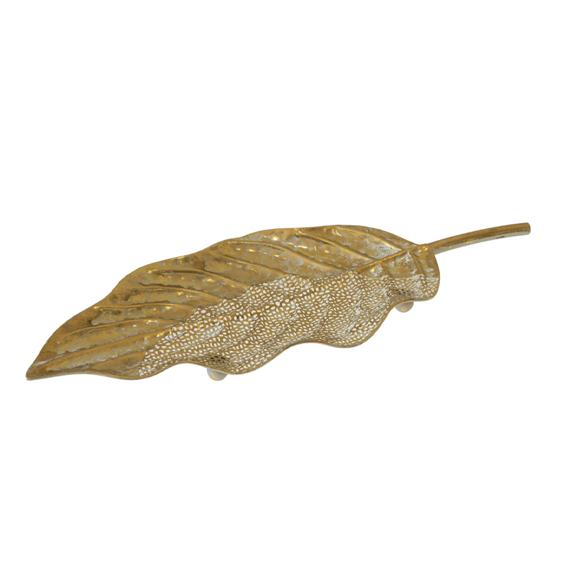 Διακοσμητική μεταλλική πιατέλα σε χρυσό χρώμα, που θα στολίσει μοναδικά το τραπέζι σας ή τον μπουφέ σας, και θα κερδίσει τα βλέμματα με το σχήμα φύλλο που διαθέτει.