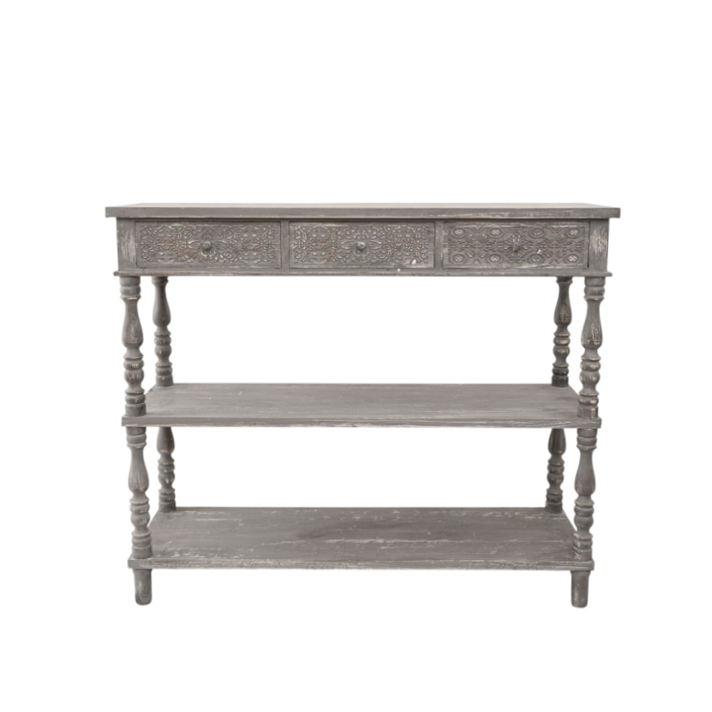 Κλασική κονσόλα με ράφια 120x40x97εκ, ιδανική για σαλόνι ή είσοδο. Συνδυάζει διαχρονική αισθητική και πρακτικότητα, προσφέροντας κομψή λύση αποθήκευσης και διακόσμησης.