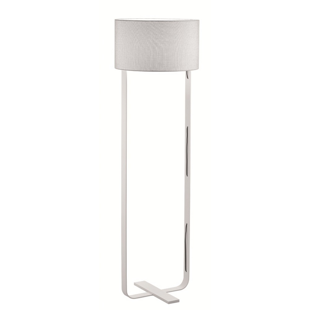 Μοντέρνο φωτιστικό δαπέδου κατασκευασμένο από μέταλλο σε λευκό χρώμα με ανοιχτό γκρι καπέλο από πλαστικοποιημένο ύφασμα.
