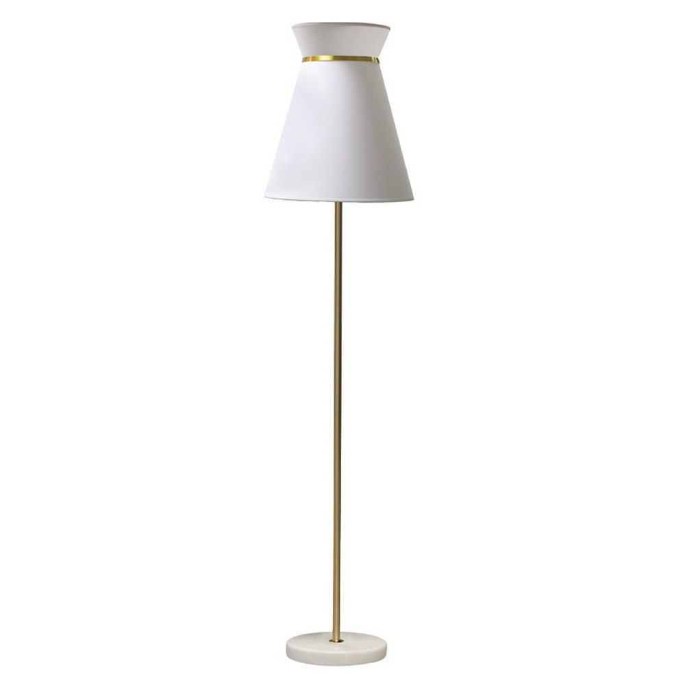 Μοντέρνο φωτιστικό δαπέδου με λευκή μαρμάρινη βάση και καπέλο από πλαστικοποιημένο ύφασμα σε λευκό χρώμα με χρυσή λεπτομέρεια.