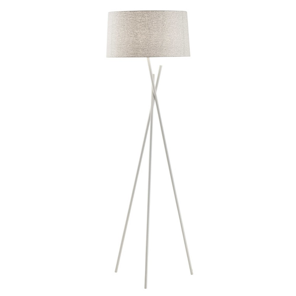Μοντέρνο φωτιστικό δαπέδου με μεταλλική βάση σε λευκό χρώμα και λευκό καπέλο από πλαστικοποιημένο ύφασμα.