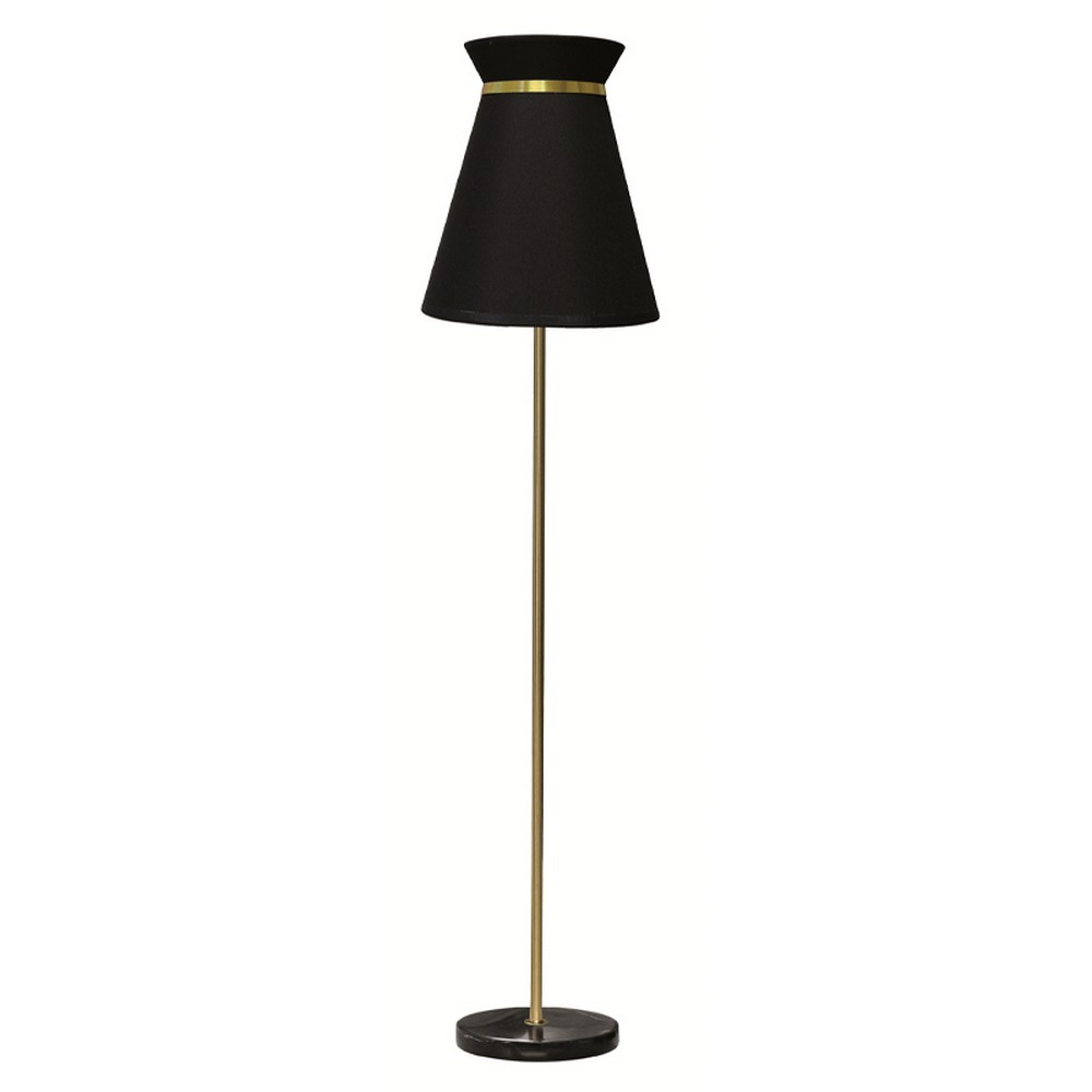 Μοντέρνο φωτιστικό δαπέδου με μαύρη μαρμάρινη βάση και καπέλο από πλαστικοποιημένο ύφασμα σε μαύρο χρώμα με χρυσή λεπτομέρεια.