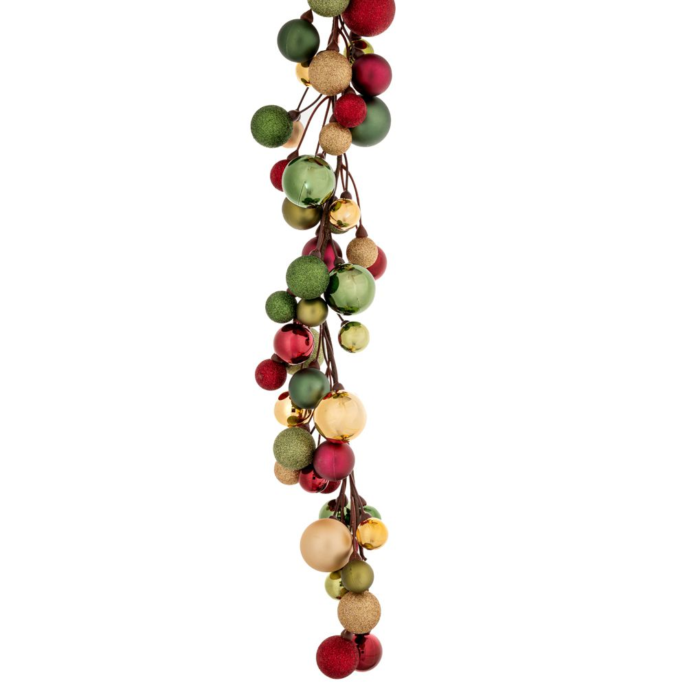 Γιορτινή γιρλάντα με κόκκινες, χρυσές και πράσινες πλαστικές μπάλες, μήκους 285εκ. Ιδανική για τη διακόσμηση του δέντρου, του τζακιού ή της εισόδου, χαρίζοντας μια κλασική και λαμπερή χριστουγεννιάτικη ατμόσφαιρα. Ανθεκτική και ελαφριά, μπορεί να χρησιμοποιηθεί ξανά κάθε χρόνο.