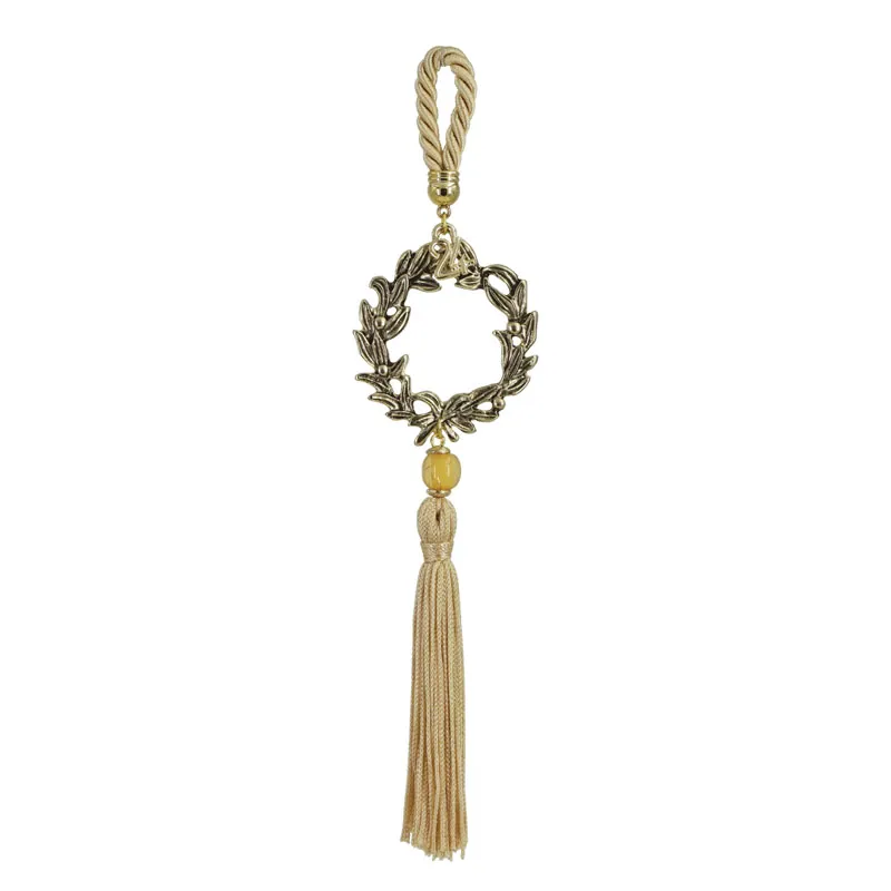 Κρεμαστό γούρι με εκρού κορδόνι και χρυσό στεφάνι, ύψους 24εκ. Ένα κομψό και συμβολικό διακοσμητικό που προσθέτει γιορτινή λάμψη και αποτελεί υπέροχη επιλογή για χριστουγεννιάτικα δώρα.