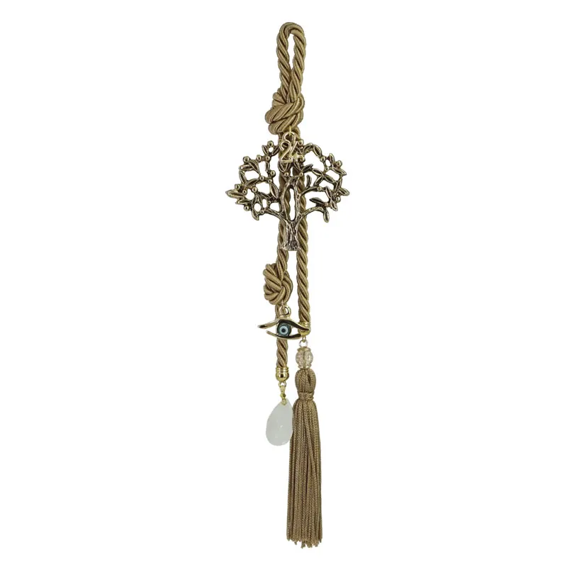 Κρεμαστό γούρι με μπεζ κορδόνι, χρυσό δέντρο και κρύσταλλο, ύψους 30εκ. Μια κομψή και διαχρονική πρόταση που προσθέτει λάμψη και θετική ενέργεια στη γιορτινή διακόσμηση. Ιδανικό και για χριστουγεννιάτικα δώρα.