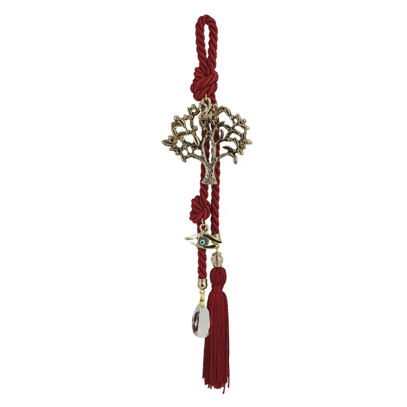 Κρεμαστό γούρι με κόκκινο κορδόνι, χρυσό δέντρο και κομψό κρύσταλλο, ύψους 30εκ. Ένα ιδιαίτερο γούρι που προσθέτει λάμψη στη γιορτινή διακόσμηση και αποτελεί εξαιρετική επιλογή για χριστουγεννιάτικα δώρα.