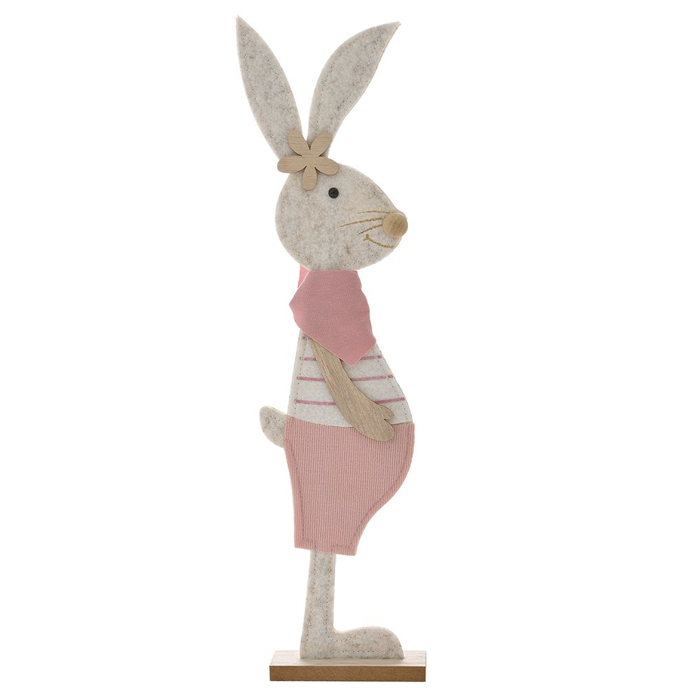 Διακοσμητικός λαγός τσόχινος σε ξύλινη βάση με ροζ-λευκά ρούχα που θα ομορφύνει κάθε χώρο που θα επιλέξετε να το τοποθετήσετε και θα αναδείξει τη γιορτινή πασχαλινή σας διάθεση.