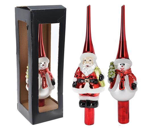 Προσθέστε μια ξεχωριστή πινελιά στη χριστουγεννιάτικη διακόσμησή σας με αυτήν τη γυάλινη κορυφή για δέντρο, διαθέσιμη σε δύο μοναδικά σχέδια: Άγιος Βασίλης και Χιονάνθρωπος. Με ύψος 25cm, αυτή η κομψή κορυφή συνδυάζει την παραδοσιακή αισθητική με μοντέρνα λεπτομέρεια, ιδανική για να ολοκληρώσει τη διακόσμηση του δέντρου σας.Κατασκευασμένη από γυαλί υψηλής ποιότητας, προσφέρει ανθεκτικότητα και λάμψη που θα εντυπωσιάσει. Επιλέξτε το σχέδιο που ταιριάζει στο στυλ σας και δημιουργήστε τη μαγική ατμόσφαιρα των Χριστουγέννων!