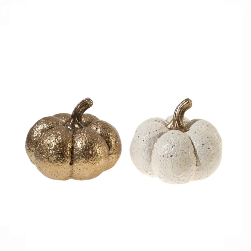 Κεραμική κολοκύθα σε χρυσό ή λευκό, διαστάσεων 16,5x16,5x13εκ, διαθέσιμη σε 2 σχέδια. Ιδανική για να στολίσετε τραπέζι, ράφι ή γιορτινές συνθέσεις με άλλα διακοσμητικά στοιχεία. Η κομψή χρωματική παλέτα και η λεπτομερής κατασκευή προσφέρουν γιορτινό στυλ και πολυτέλεια στον χώρο, ενώ τα 2 σχέδια δίνουν επιλογές για δημιουργικούς συνδυασμούς.