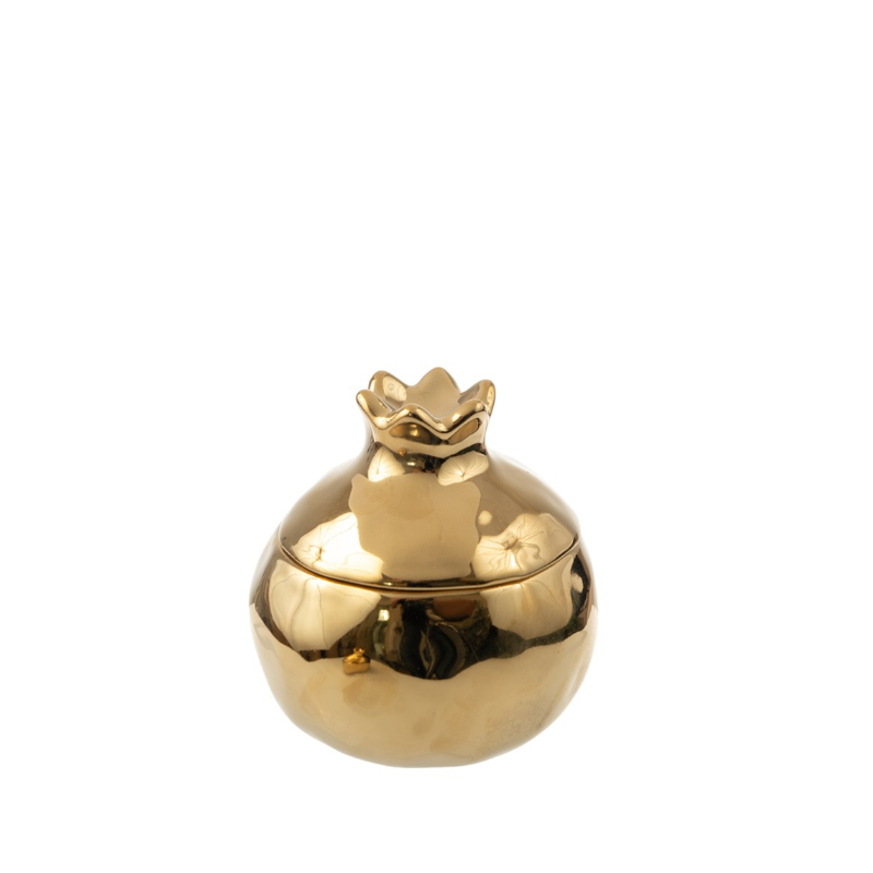 Δώστε πολυτελή και γιορτινή αίσθηση στη διακόσμησή σας με το κεραμικό ρόδι με καπάκι σε χρυσό γυαλιστερό φινίρισμα. Με ύψος 10,16 cm, αποτελεί κομψό και πρακτικό διακοσμητικό αντικείμενο, ιδανικό για τραπέζια, ράφια ή συνθέσεις δώρων. Το γυαλιστερό χρυσό φινίρισμα προσφέρει λαμπερή και εορταστική εμφάνιση, ενώ η κεραμική κατασκευή εξασφαλίζει αντοχή και μακροχρόνια χρήση.