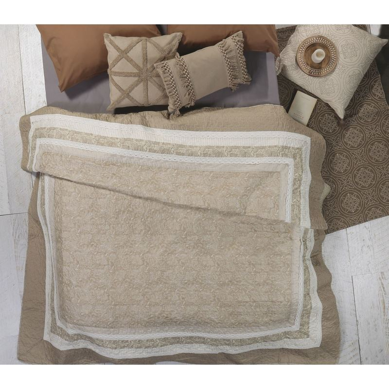 Kουβερλί υπέρδιπλο, διάστασης 220x240cm, με ύφασμα από 100% microfiber, peach-skin φινίρισμα και γέμισμα από 100% πολυεστέρα, βάρους 200gr/m2.
