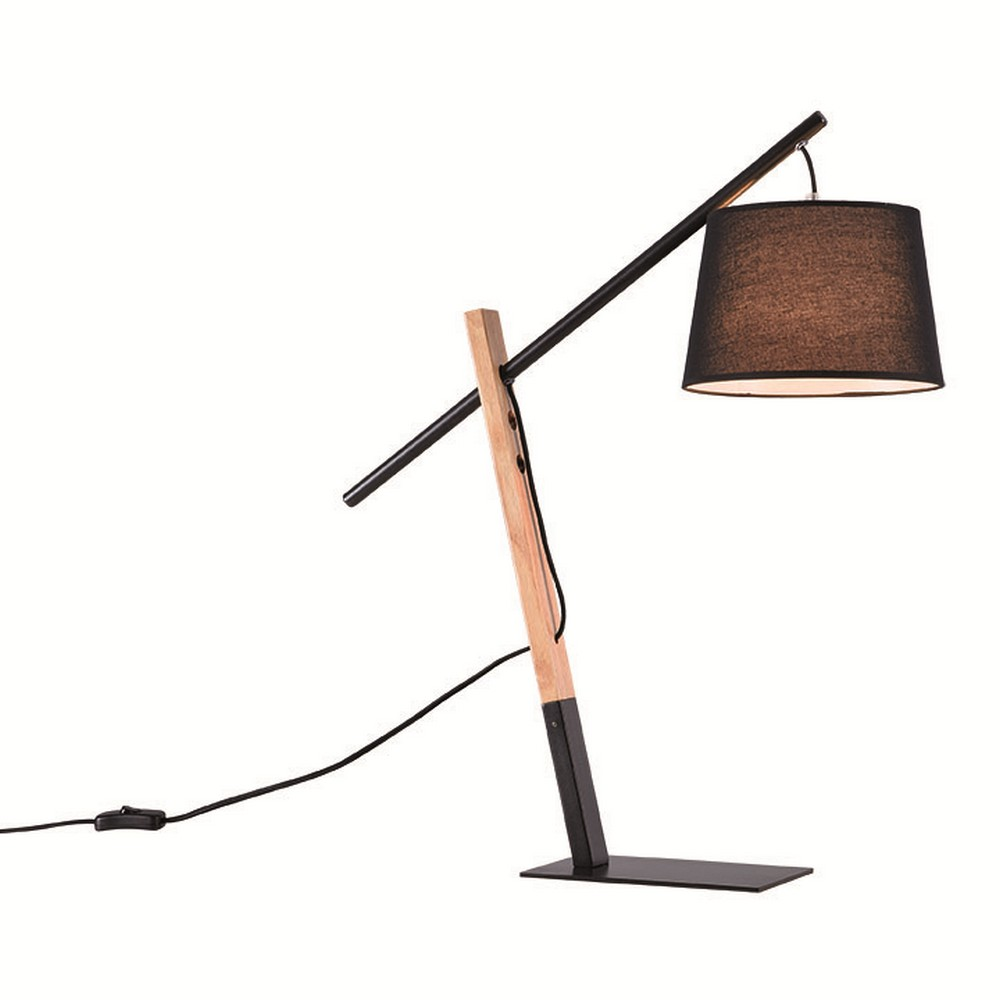 Μοντέρνο επιτραπέζιο φωτιστικό κατασκευασμένο από μέταλλο σε μαύρο χρώμα, με ξύλινη λεπτομέρεια και λευκό εσωτερικό.