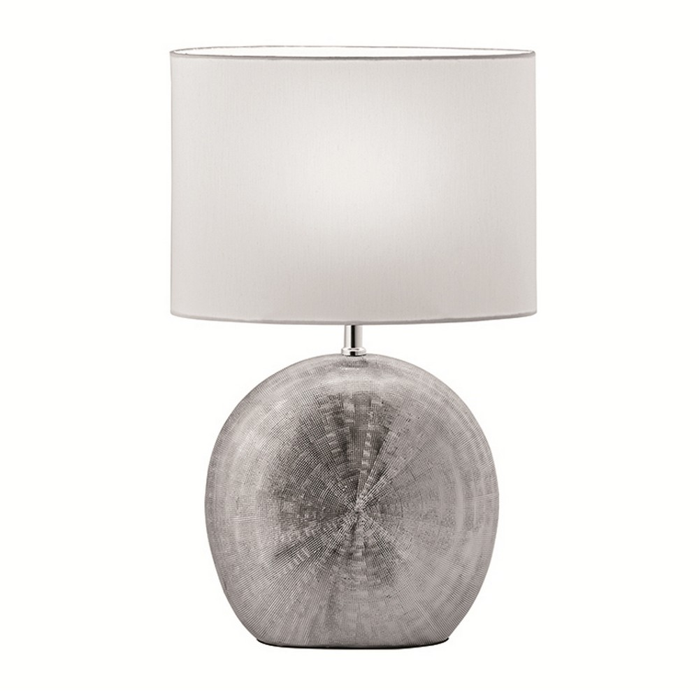 Μοντέρνο επιτραπέζιο φωτιστικό με λευκό καπέλο από πλαστικοποιημένο ύφασμα και κεραμική βάση σε ασημί χρώμα.