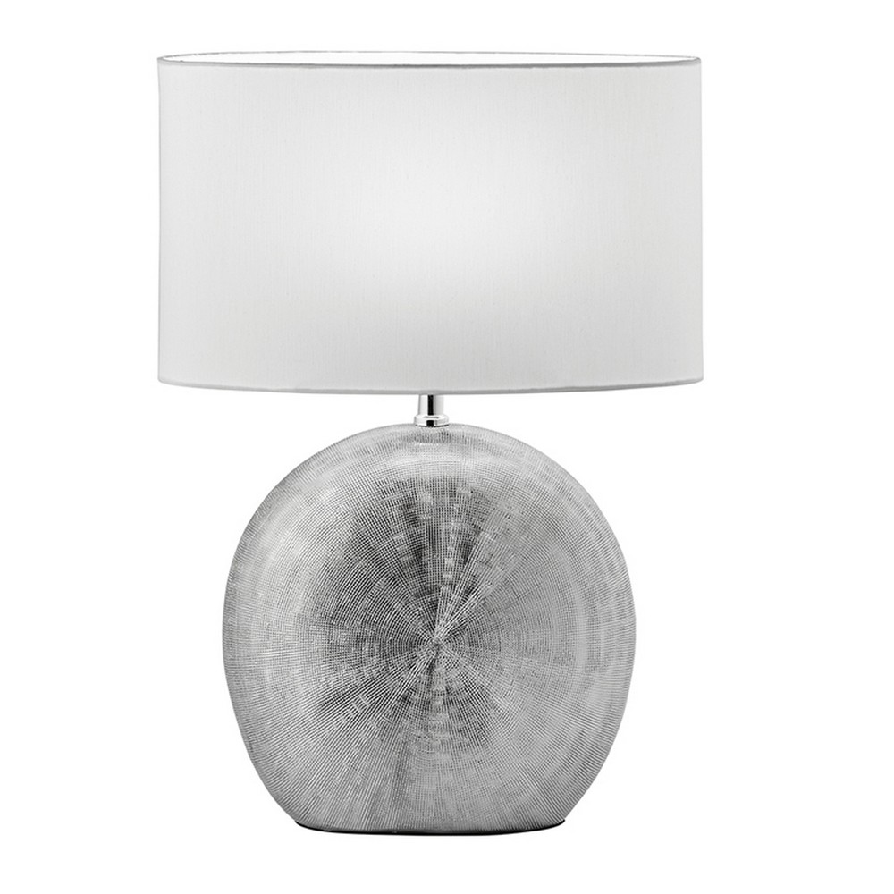Μοντέρνο επιτραπέζιο φωτιστικό με λευκό καπέλο από πλαστικοποιημένο ύφασμα και κεραμική βάση σε ασημί χρώμα.
