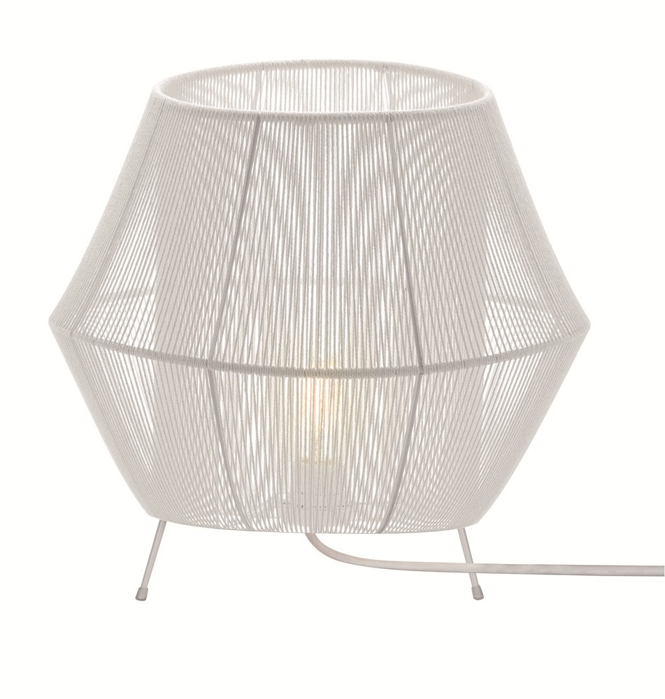 Επιτραπέζιο φωτιστικό με λευκό καπέλο από κορδόνι και μεταλλική λευκή βάση.
