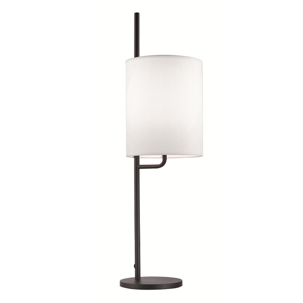 Επιτραπέζιο φωτιστικό με λευκό καπέλο από πλαστικοποιημένο ύφασμα και μεταλλική μαύρη βάση.