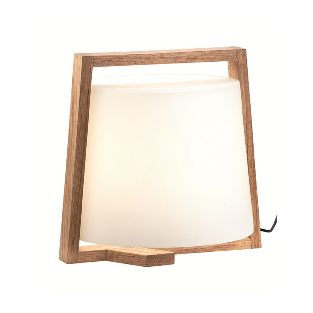 Μοντέρνα λάμπα με γυαλί σατινάτο σε λευκό χρώμα και ξύλινη βάση σε φυσικό χρώμα.