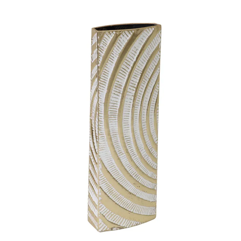Αναδείξτε τον χώρο σας με αυτό το κομψό μεταλλικό βάζο σε χρυσό και λευκό χρώμα με σχέδιο ημικυκλικών κύκλων. Ιδανικό για μοντέρνα ή πολυτελή διακοσμητικά περιβάλλοντα, συνδυάζει την ανθεκτικότητα του μετάλλου με μια μοναδική αισθητική λεπτομέρεια. Το βάζο προσφέρει κομψότητα και στυλ σε σαλόνια, γραφεία ή χώρους υποδοχής.