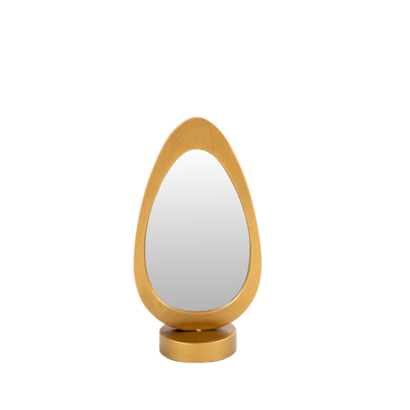 Κομψός μεταλλικός επιτραπέζιος καθρέπτης σε χρυσό χρώμα, ιδανικός για μπουντουάρ ή διακόσμηση χώρου. Συνδυάζει λειτουργικότητα και διαχρονικό στυλ.