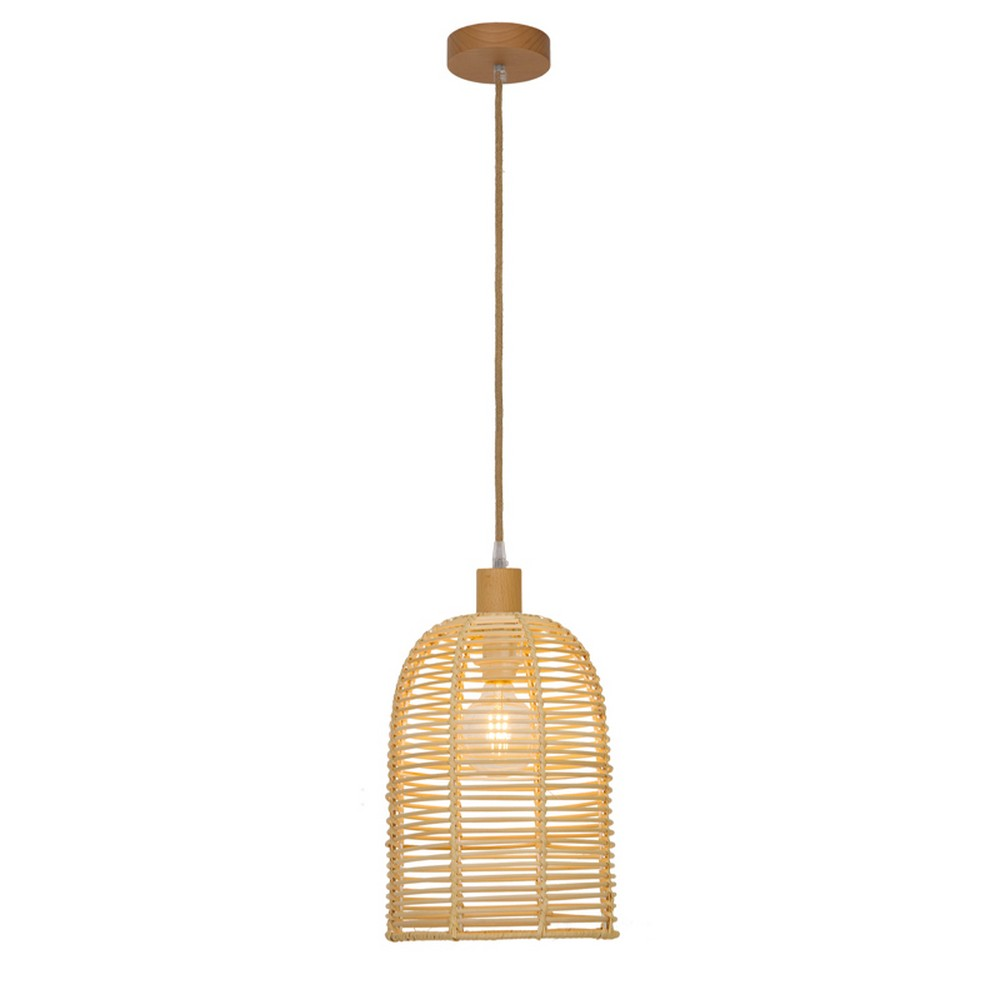 Κρεμαστό φωτιστικό οροφής με πλέξη από ρατάν σε φυσικό χρώμα και ξύλινη ανάρτηση.