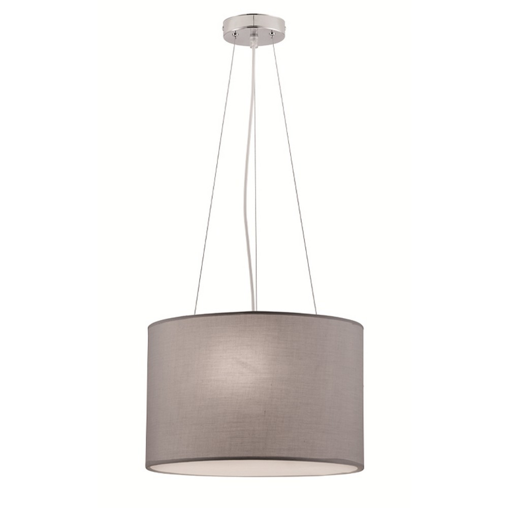 Τρίφωτο φωτιστικό οροφής με μεταλλική ανάρτηση σε απόχρωση χρωμίου και υφασμάτινο αμπαζούρ σε γκρι χρώμα με λευκό κάλυμμα στην κάτω πλευρά.
