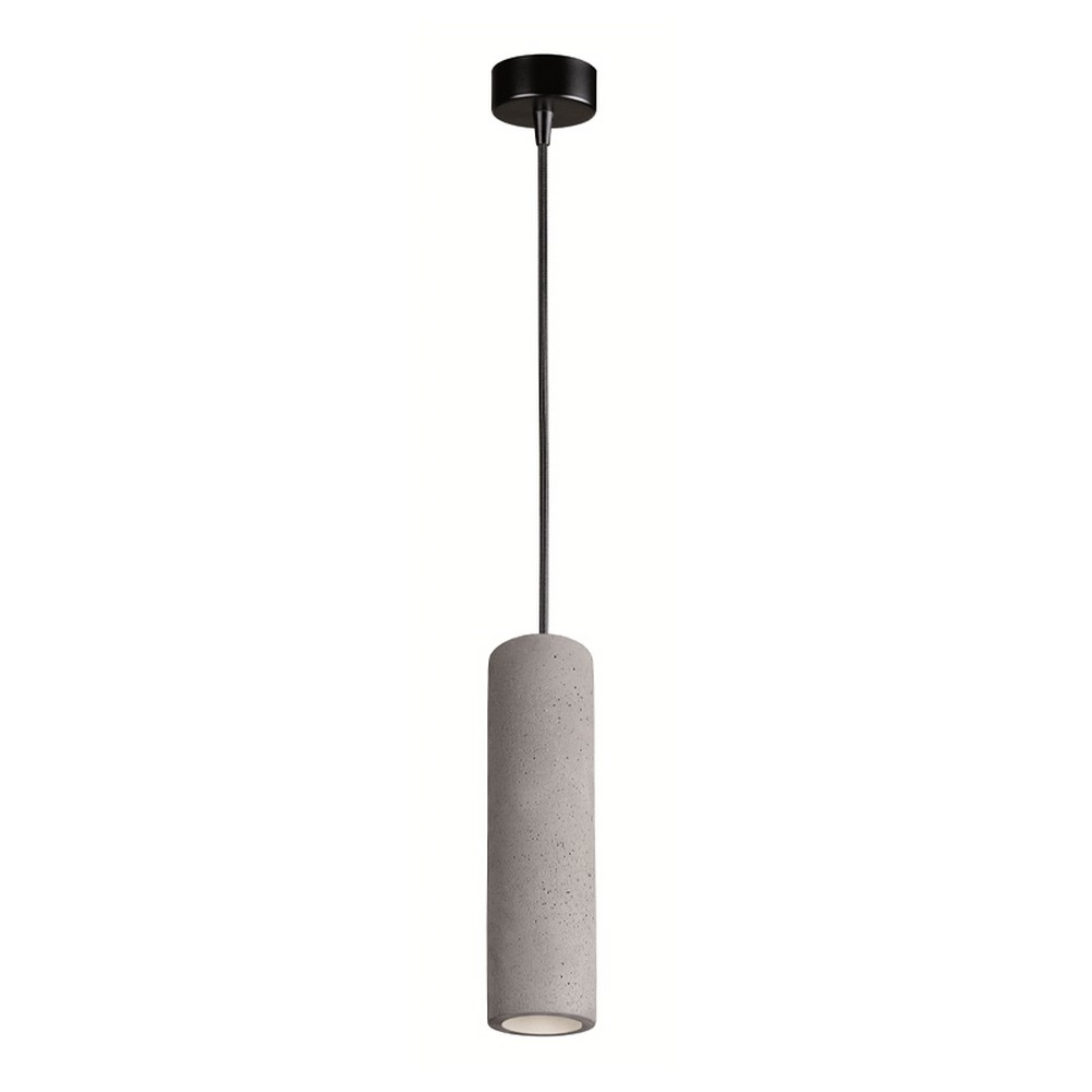 Κρεμαστό φωτιστικό οροφής με καπέλο από τσιμέντο σε γκρι χρώμα με λευκό εσωτερικό και μαύρη ανάρτηση με υφασμάτινο καλώδιο.