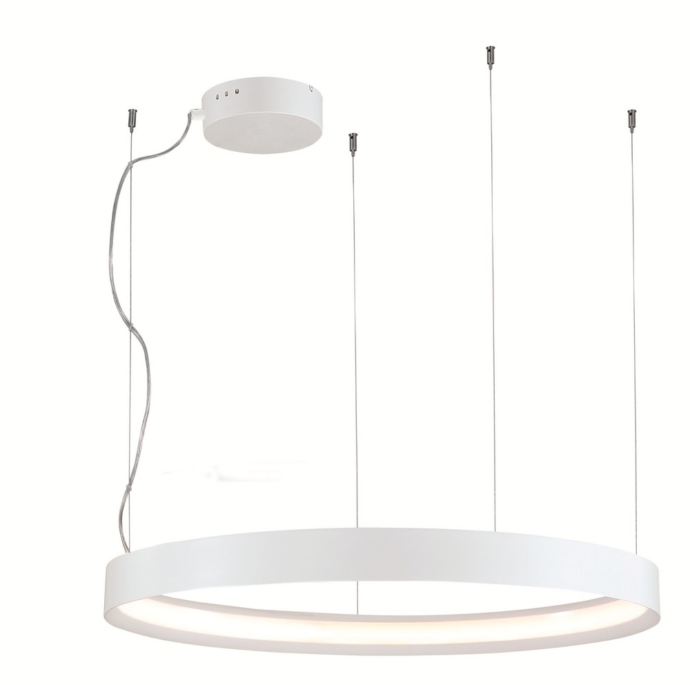Μοντέρνο κρεμαστό φωτιστικό κατασκευασμένο από μέταλλο σε λευκό χρώμα. Διαθέτει ενσωματωμένο φωτισμό LED συνολικής ισχύος 87 w και απόδοσης 6526 Lumen σε θερμό λευκό χρώμα (3000K).