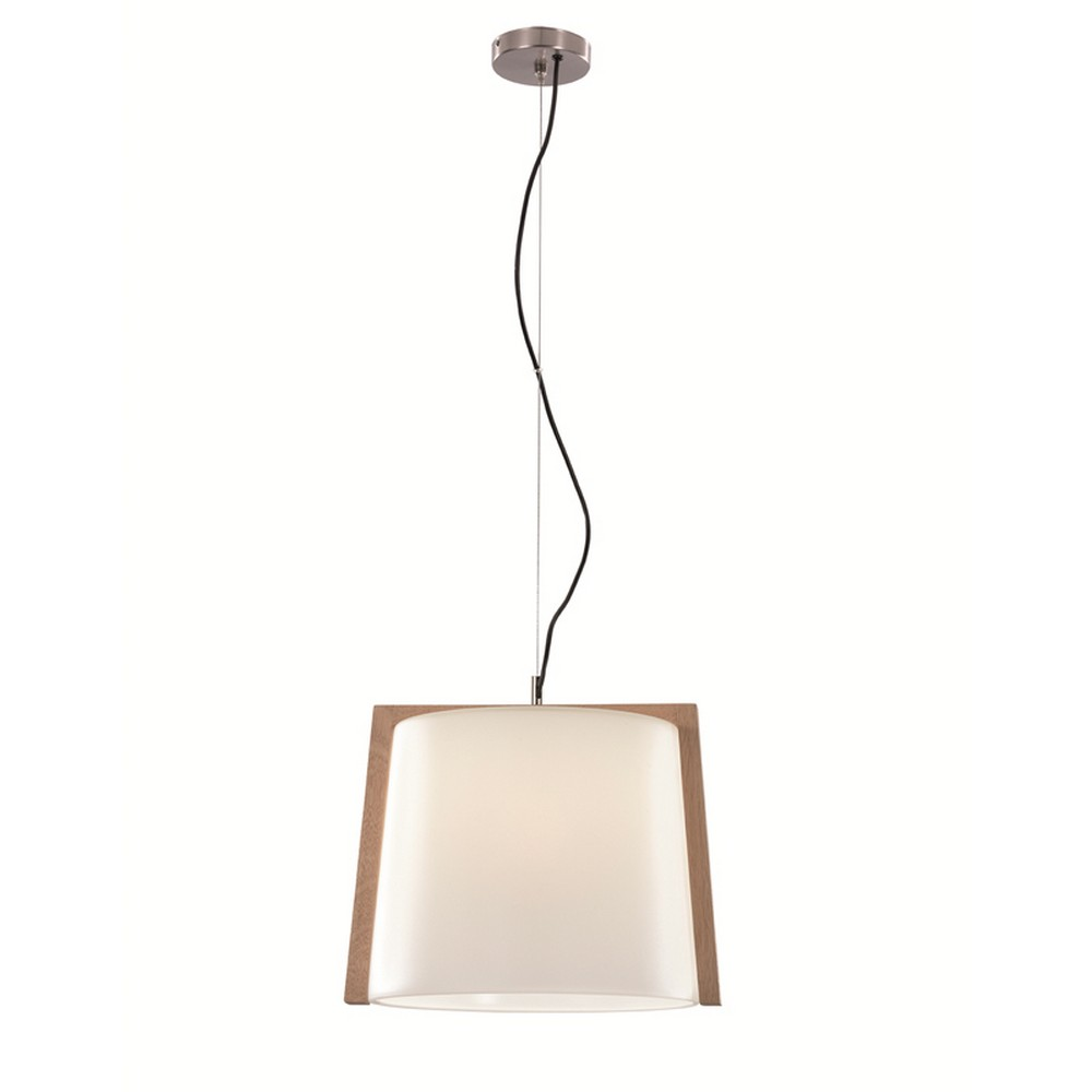 Μοντέρνο μονόφωτο φωτιστικό οροφής με γυαλί σατινάτο σε λευκό χρώμα και μαύρη-ασημί ανάρτηση με ξύλινα στοιχεία σε φυσικό χρώμα.