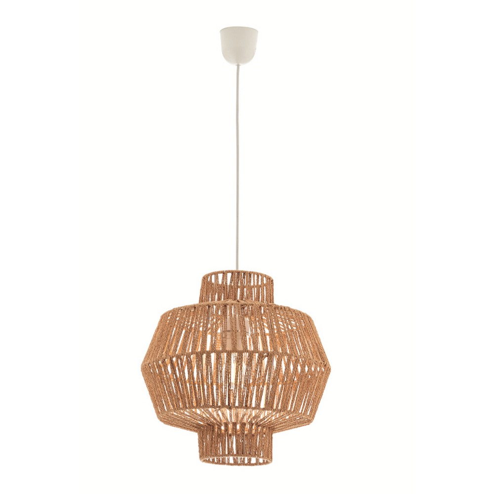 Κρεμαστό φωτιστικό οροφής με καπέλο από σχοινί σε φυσικό χρώμα και λευκή ανάρτηση.