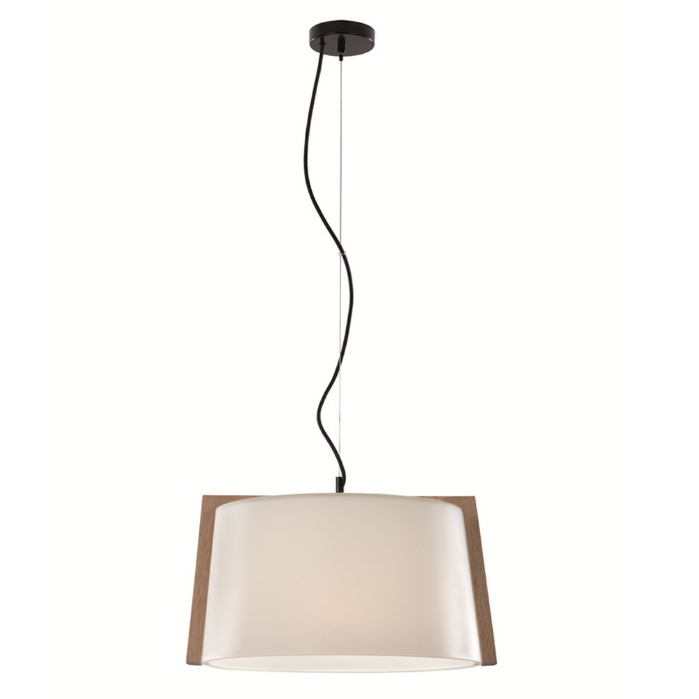 Μοντέρνο μονόφωτο φωτιστικό οροφής με γυαλί σατινάτο σε λευκό χρώμα και μαύρη ανάρτηση με ξύλινα στοιχεία σε φυσικό χρώμα.