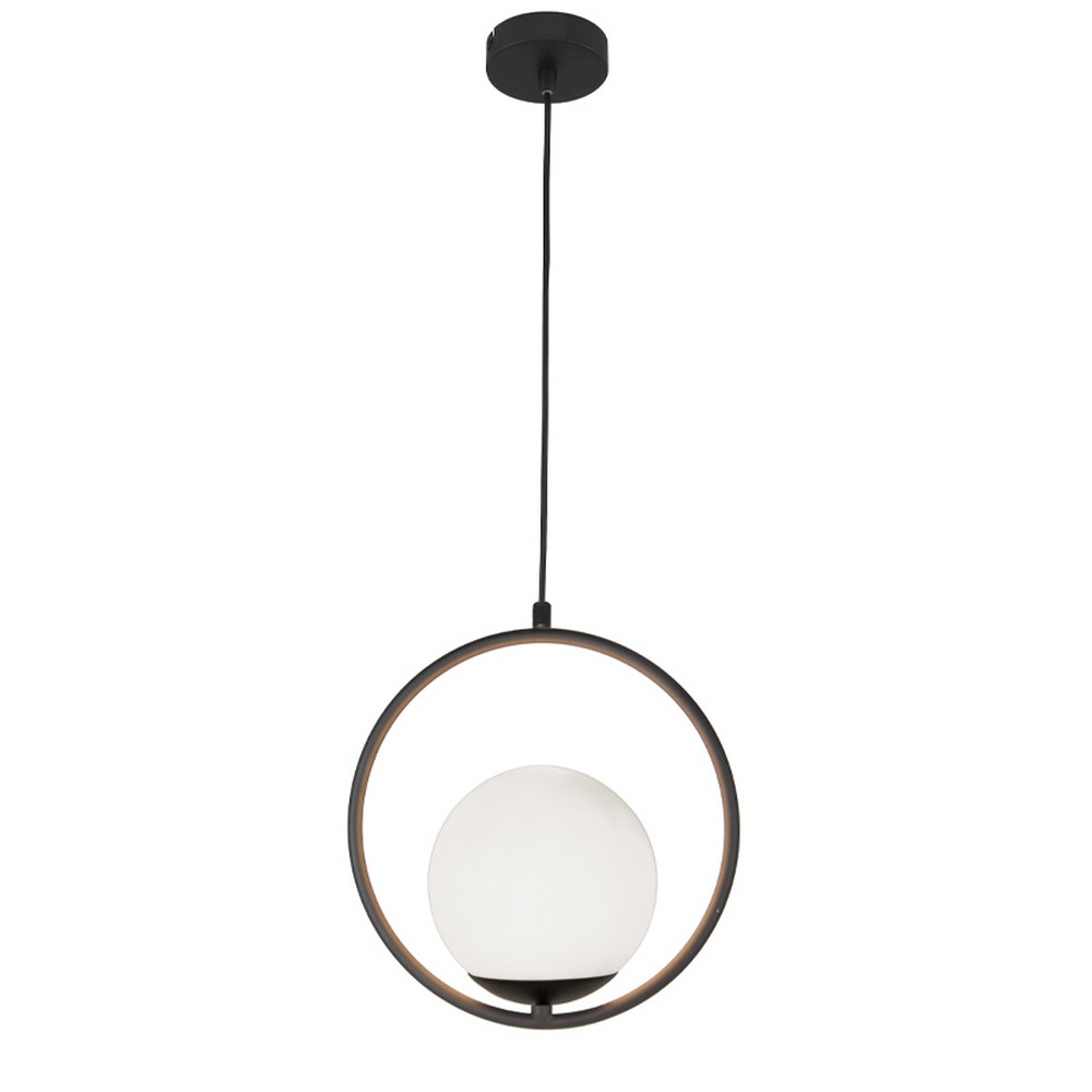 Μοντέρνο φωτιστικό οροφής με λευκή μπάλα από οπάλ γυαλί και μεταλλική ανάρτηση σε μαύρο χρώμα.