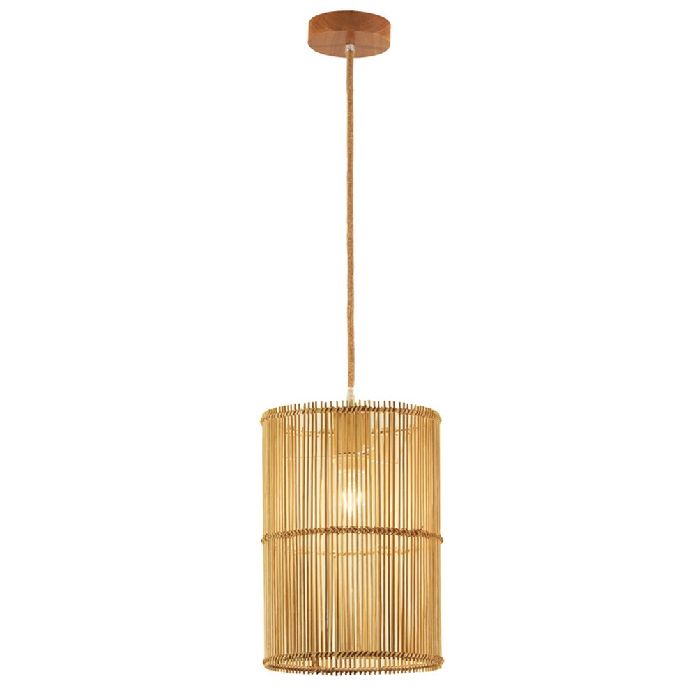 Κρεμαστό φωτιστικό οροφής με πλεκτό καπέλο από ρατάν σε φυσικό χρώμα και ξύλινη βάση.