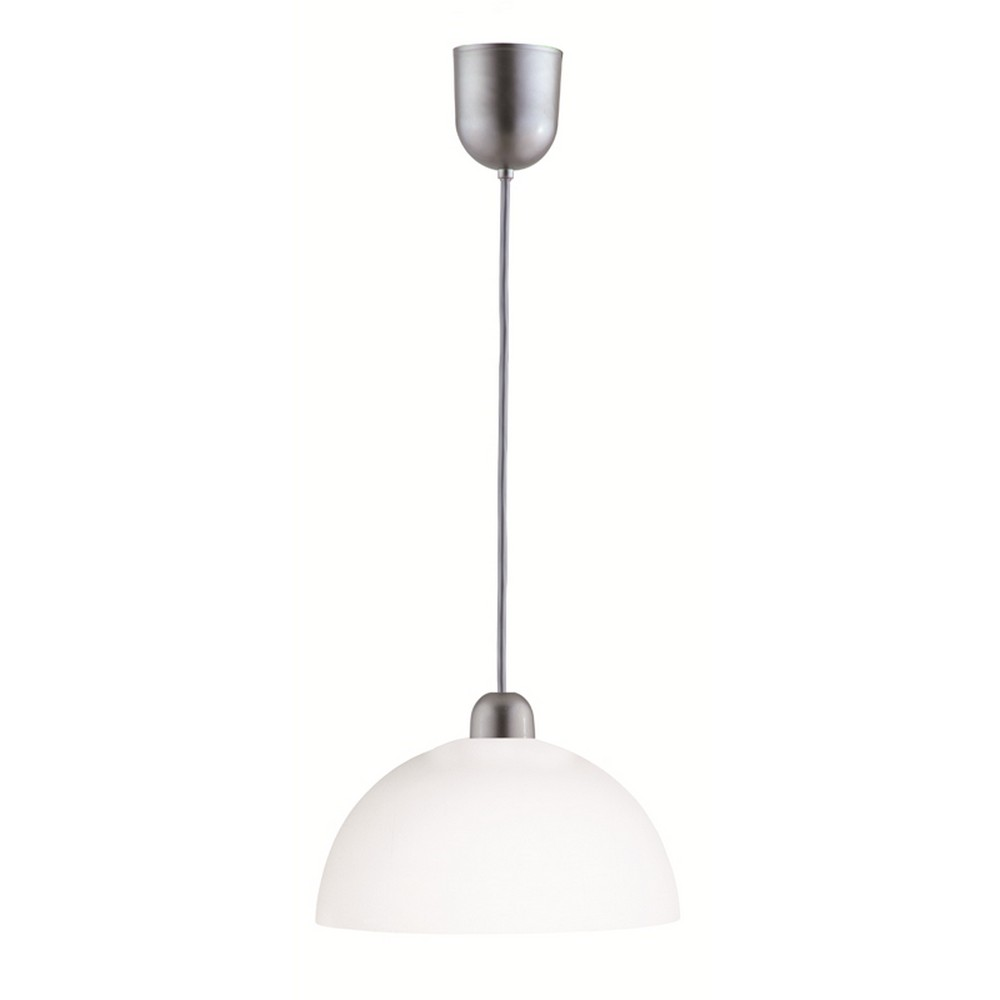 Κρεμαστό φωτιστικό οροφής με πλαστική ανάρτηση σε ασημί χρώμα και γυαλί σε λευκό ντεκόρ.