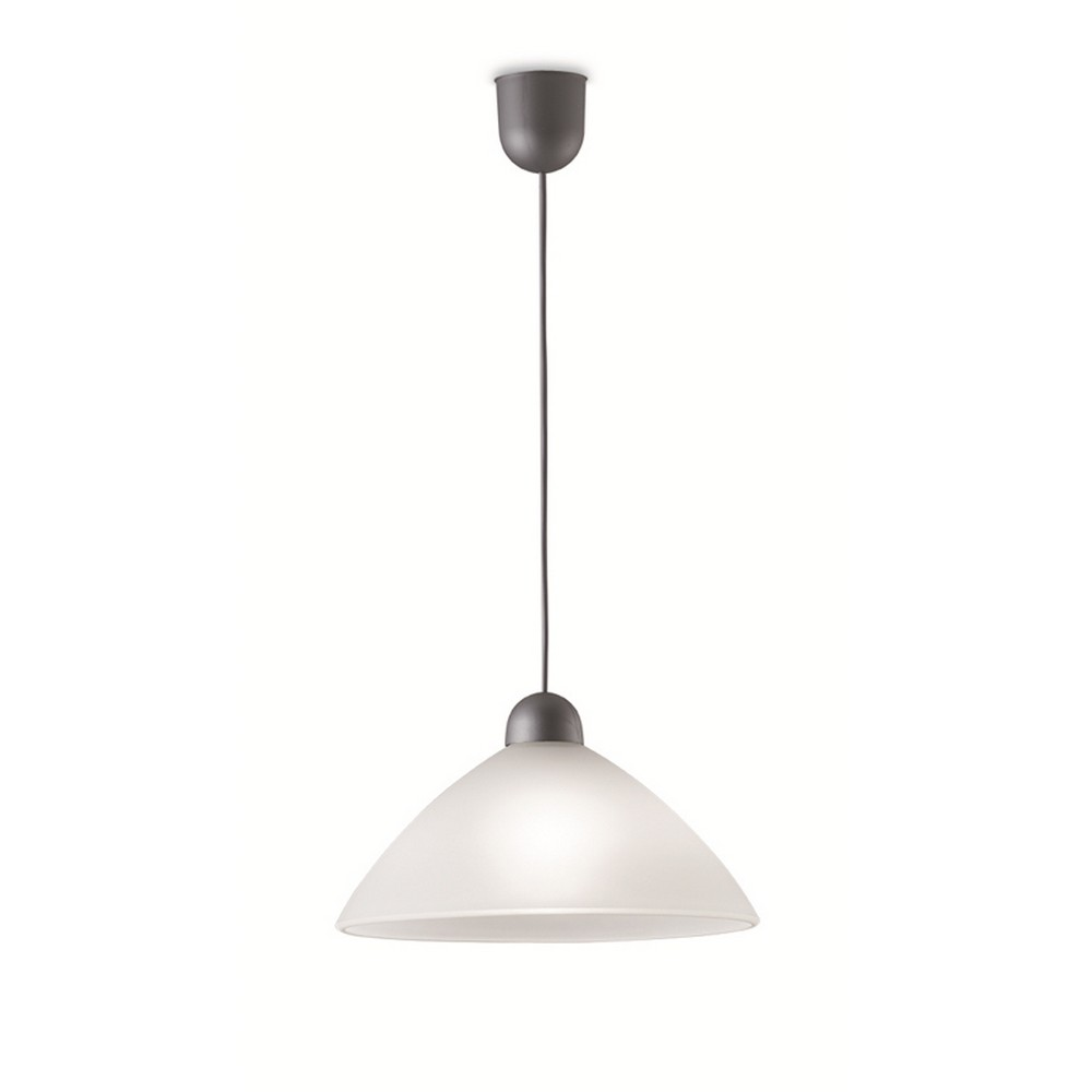 Κρεμαστό φωτιστικό οροφής με πλαστική ανάρτηση σε ασημί χρώμα και λευκό γυαλί.