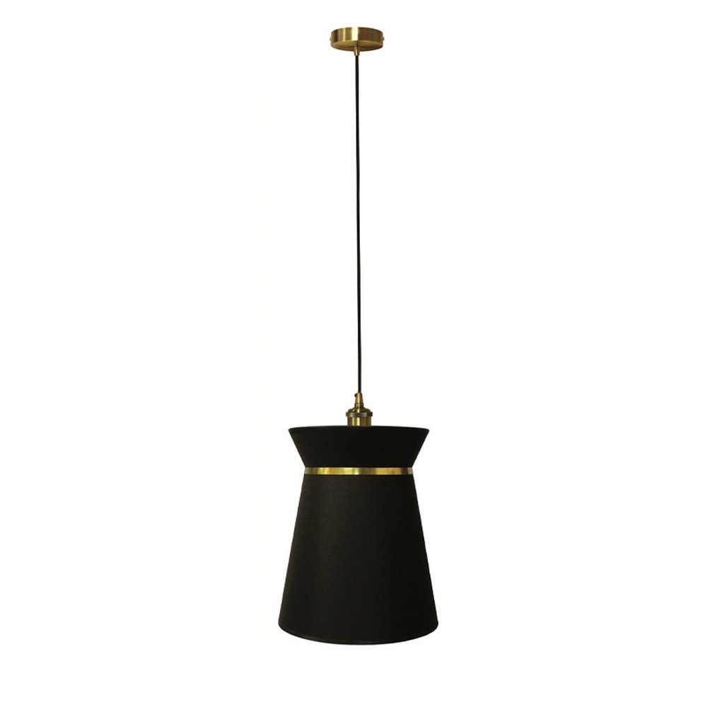 Μοντέρνο φωτιστικό οροφής με χρυσή ανάρτηση και καπέλο από πλαστικοποιημένο ύφασμα σε μαύρο χρώμα με χρυσή λεπτομέρεια.