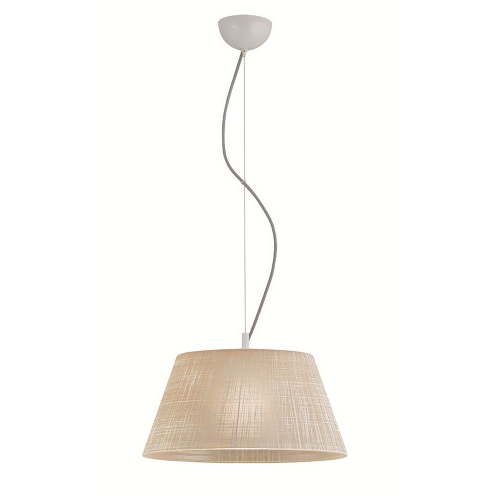 Κρεμαστό φωτιστικό οροφής με ανάρτηση σε λευκό χρώμα. Το γυαλί του είναι μπεζ με χειροποίητο ντεκόρ λινού.
