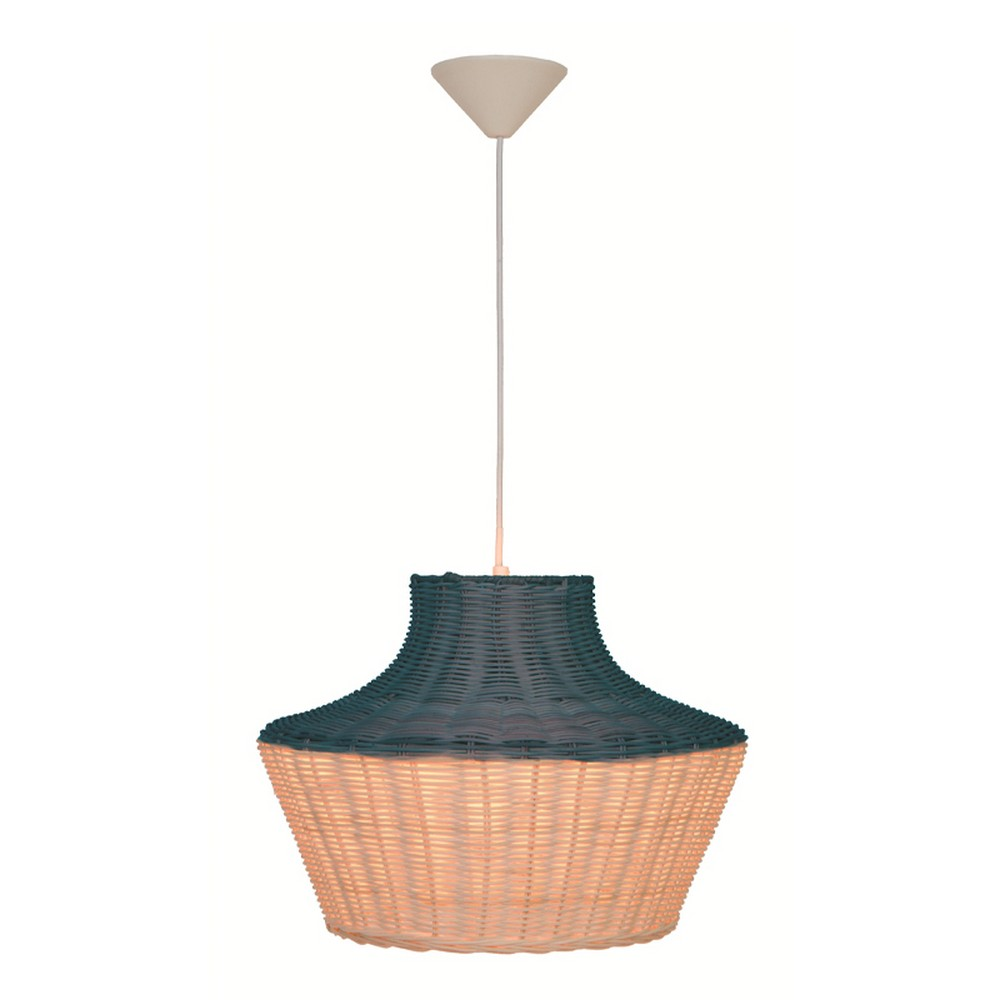 Κρεμαστό φωτιστικό οροφής με ψάθινο πλεκτό καπέλο σε φυσικό-μπλε χρώμα και λευκή ανάρτηση.