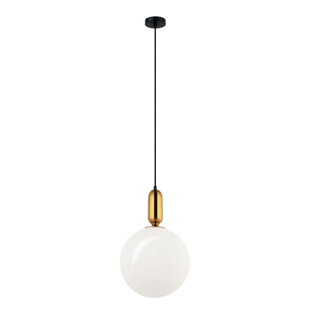 Μοντέρνο φωτιστικό οροφής με λευκή μπάλα από οπάλ γυαλί και μεταλλικό σκελετό σε χρυσό χρώμα.