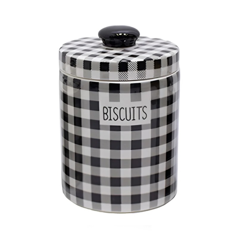 Μπισκοτιέρα κεραμικη καρώ σε μαύρο-άσπρο χρώμα. Συνδυάστε τη με άλλα δοχεία τροφίμων της ίδιας σειράς και στολίστε μοναδικά τον πάγκο της κουζίνας σας.